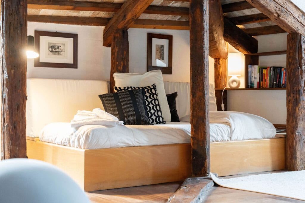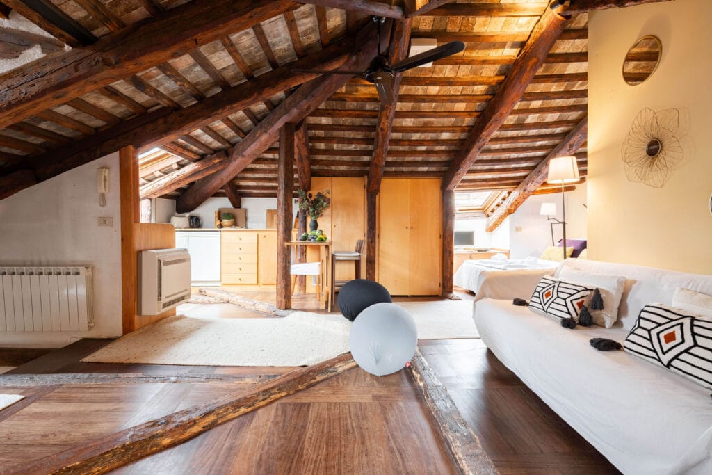 This apartment has a comfortable double bed and a single bed in a single large open space with wooden beams on the converging ceiling and also on the floor. There is a bathroom with shower and all utilities and electric supply (phon, dishwasher, washing machine, internet, air conditioning, kettle, toaster and microwave).
