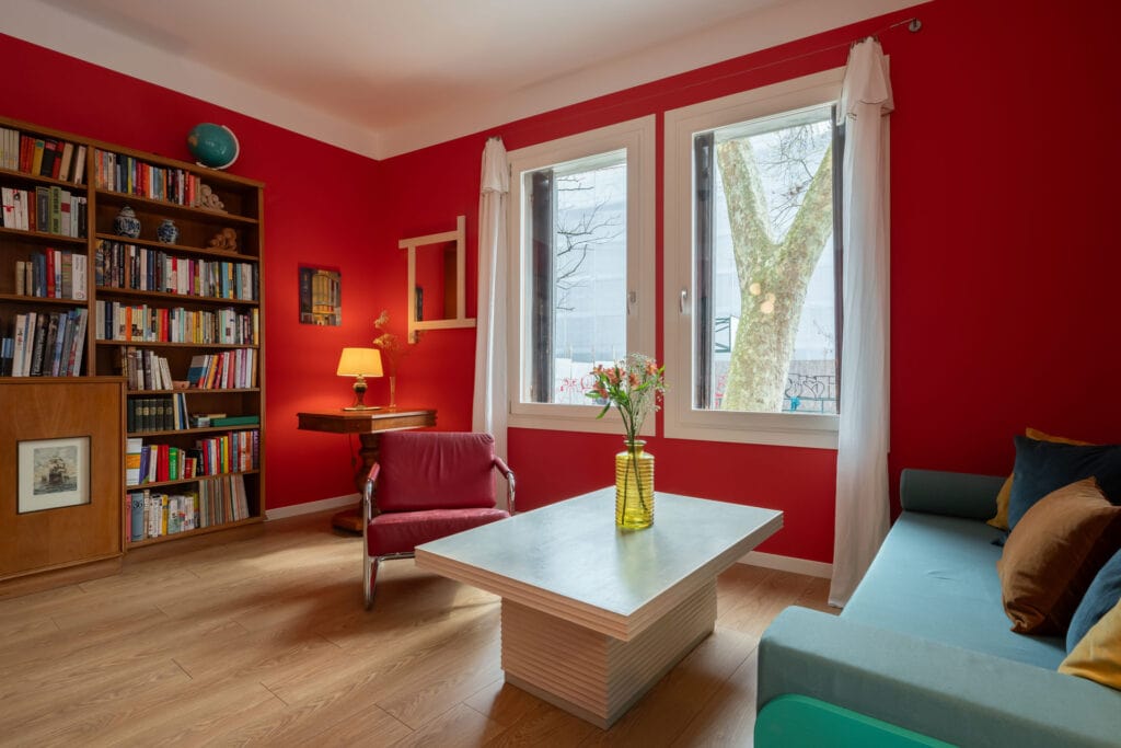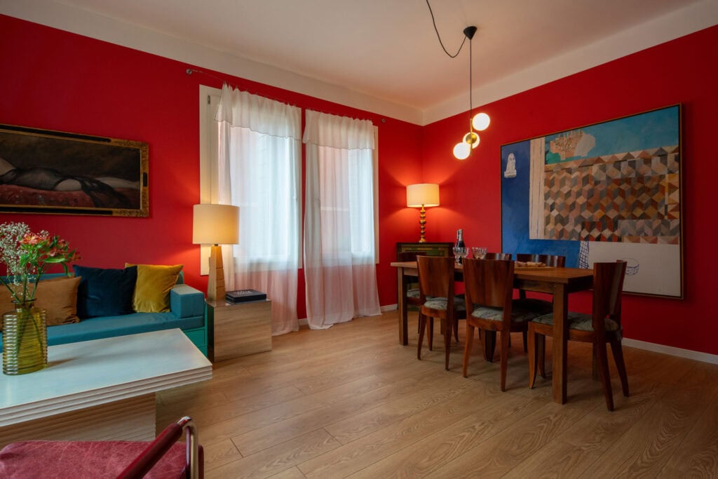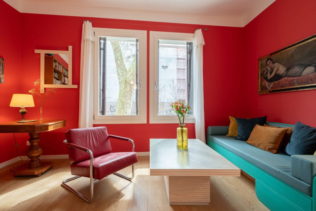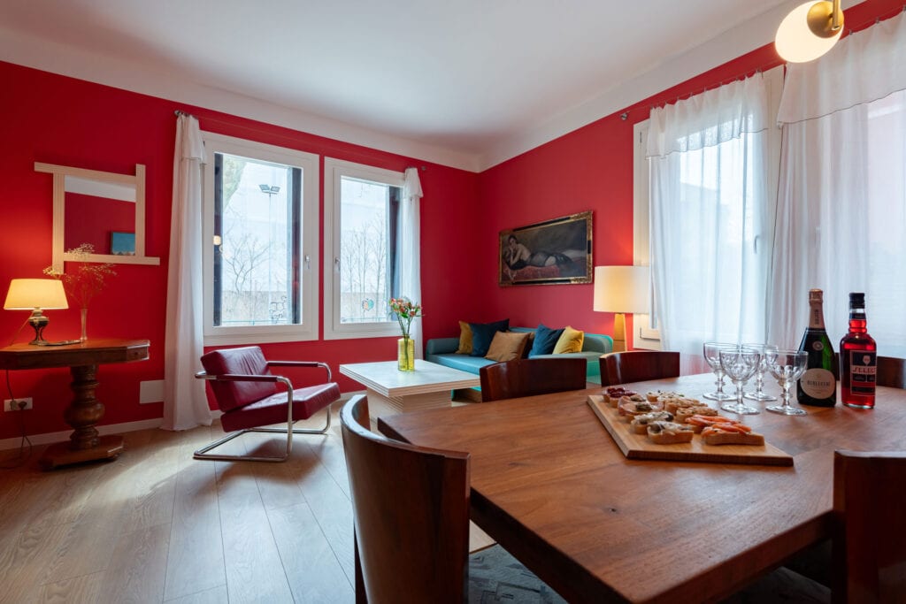 Warm and stylish living room with colorful walls, large sofa and bright windows overlooking the canal, in the Ca’ Maddalena – Sole apartment