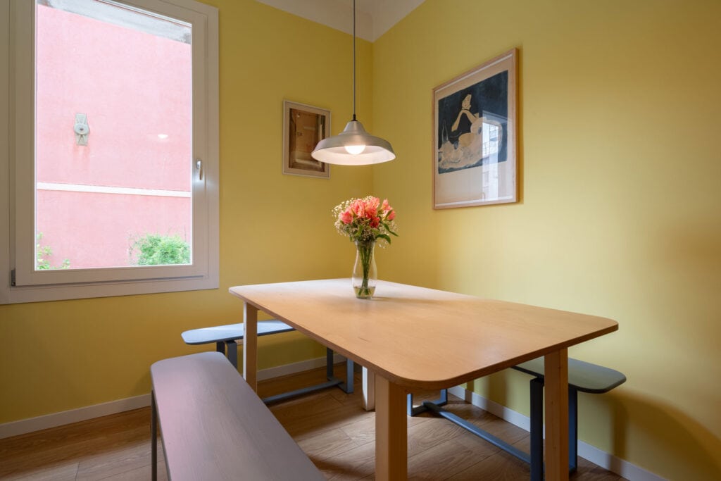 Elegant open-space dining area with canal view at Maestrale Apartment in Venice.