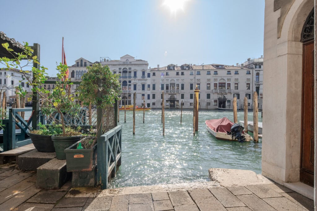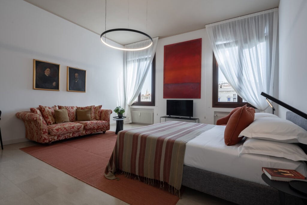 Ca’ Marcello Ponente is an elegant open-space apartment located on the third floor of Palazzo Marcello dei Leoni, a prestigious historic building overlooking the Grand Canal. Two large windows open directly onto the water, filling the space with natural light and offering an enchanting view that creates a romantic and serene atmosphere.