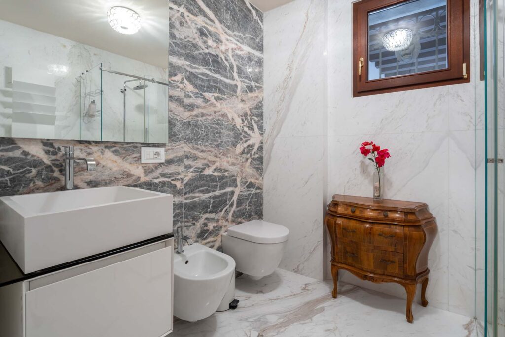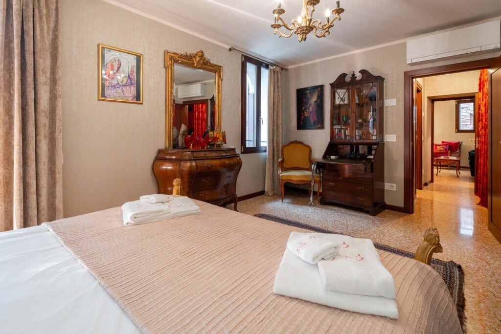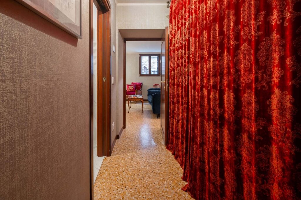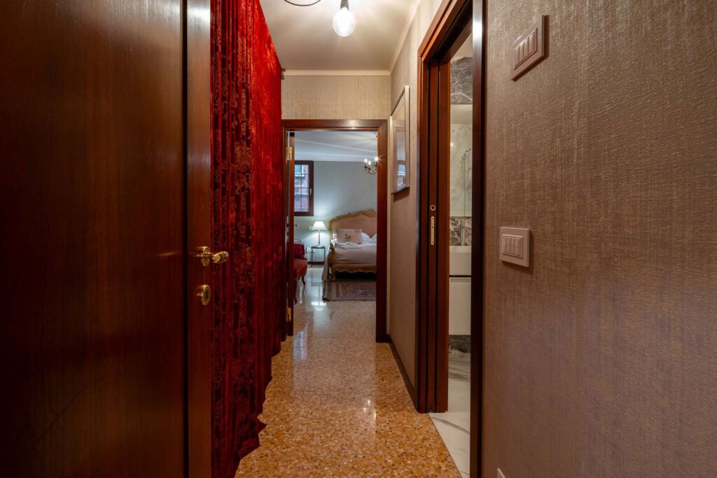 Garzoni-Moro is a prestigious late-Gothic palazzo located in the middle of the bend of the Grand Canal. The area of San Samuele and Santo Stefano has always been a favorite of the most important Venetian families for their private residence. Equally distant from San Marco – political and religious center – and Rialto – the business and finance heart of the city – it was the perfect location for families to exercise their power and manage their interests during the 1000-year history of the Venetian Republic. The first Venetian settlement in fact dates back to before the 10th century, while the first palazzo was built in the 12th century. Palazzo Garzoni-Moro was built in the 15th century and completely restored in 2017. It consists of a large main residence overlooking the Grand Canal, and 8 apartments on the opposite side of the building overlooking the private courtyard, the nearby canal, and the Venetian rooftops. The location is very calm and quiet despite it being close to the city’s main attractions, like the Guggenheim Collection museum, Gallerie dell’Accademia, Ca’ d’Oro-Giorgio Franchetti museum and gallery, Palazzo Giustiniani, and Palazzo Fortuny. Furthermore, the proximity to Salizada San Samuele, Calle della Mandola, and Campo San Maurizio means being close to many shops, restaurants, and the famous outdoor antique market of San Maurizio. Literally five minutes from Palazzina G and the Bauer Hotel, both exclusive spots of Venetian nightlife, this apartment allows you to be at the heart of the city’s most important events, especially during the Venice Film Festival and the Art and Architecture Biennale. The building has been masterfully restored, with easy home automation devices, heated floors, elevator, and central air conditioning and newly designed bathrooms and kitchens.
