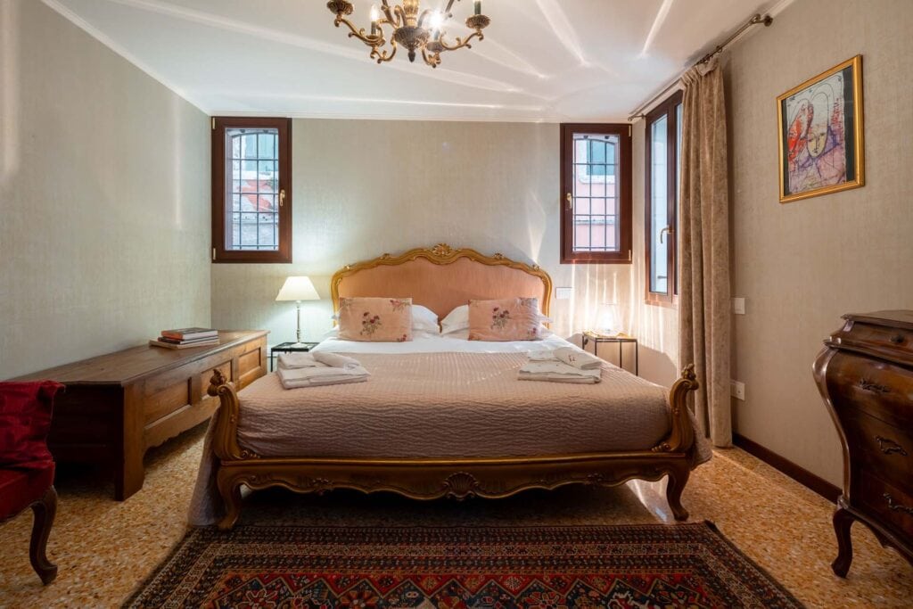 6 steps from the courtyard bring you directly to the apartment door, and many small windows wrap around the whole house. It overlooks the small adjoining canal and part of Palazzo Garzoni – Moro’s private courtyard. It has one double bedroom, a living room with open kitchen and dining table, and one marble bathroom with shower cabin. Antique glass collectibles and furnishings decorate the apartment. The kitchen is fully equipped and WiFi is included.