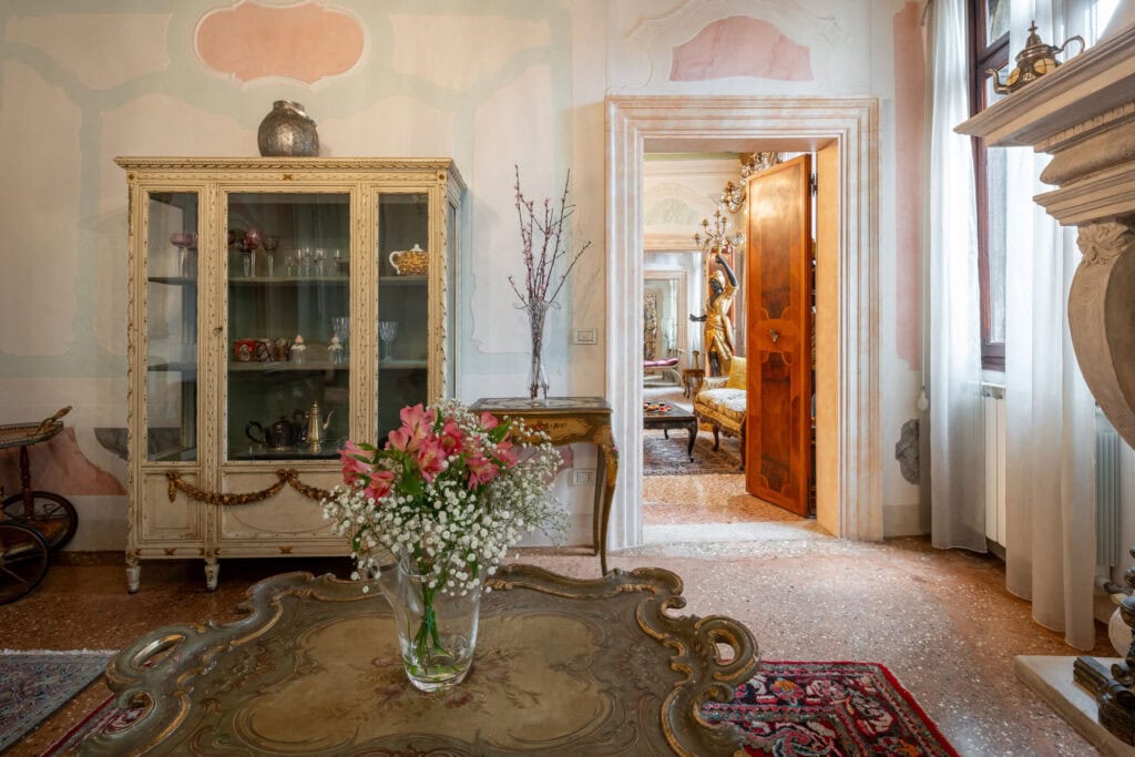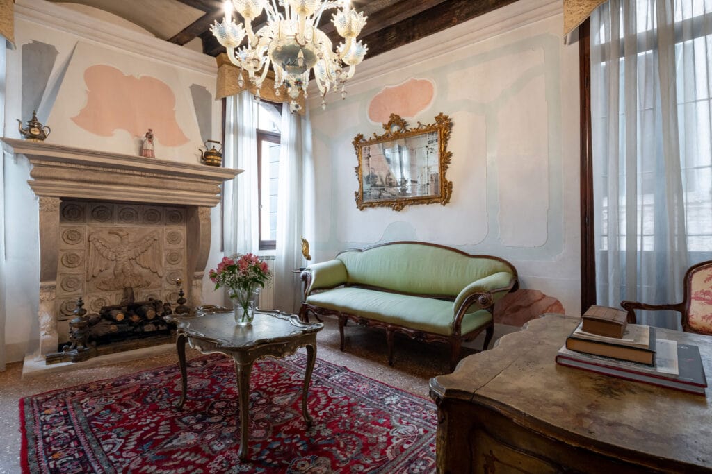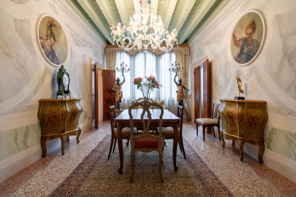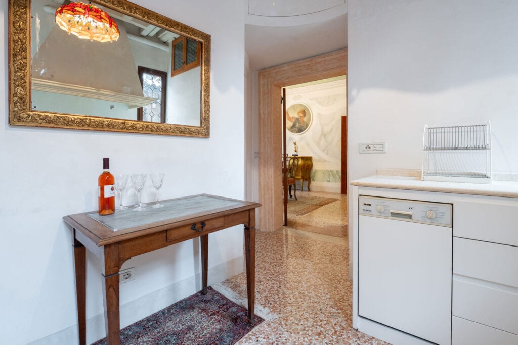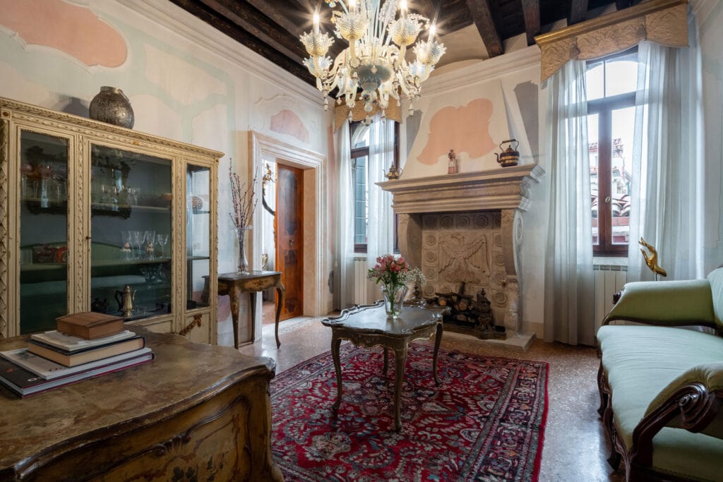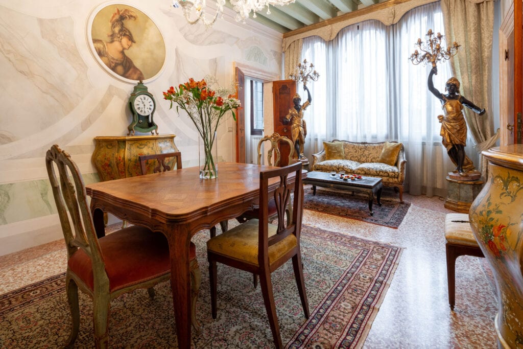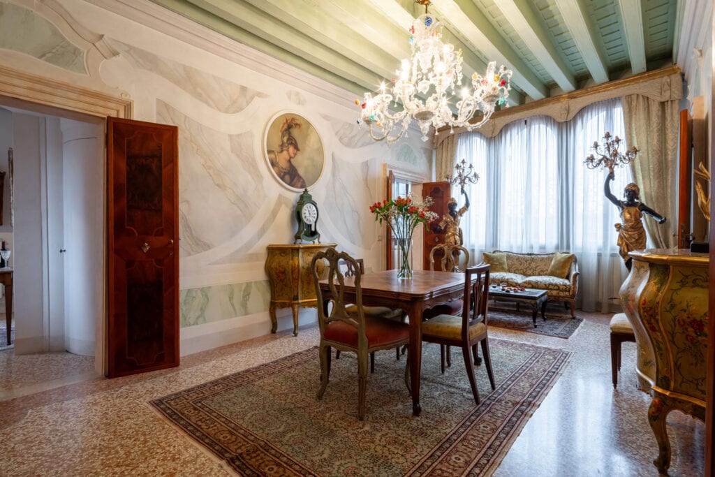 This apartment is located in the San Samuele area within the San Marco District. Decorated in a typical Venetian style it has stucco decorations on the walls and ceiling of the apartment, typical Venetian “Rezzonico” chandeliers and being on a second floor, it is very bright with more than 10 windows facing all four side of the building.
