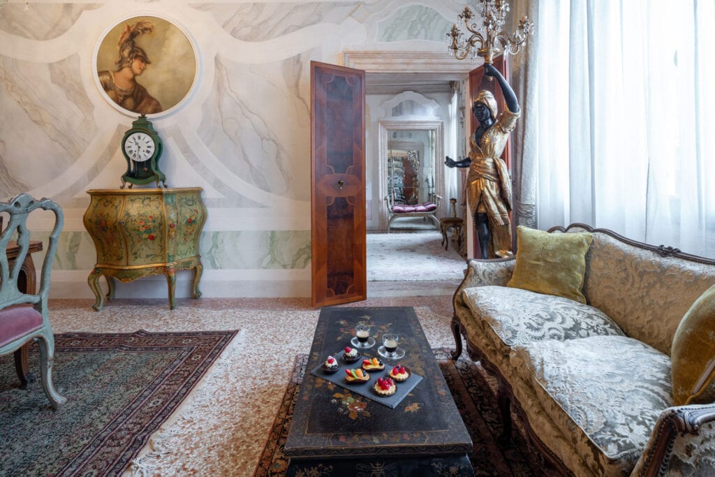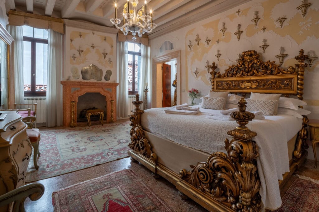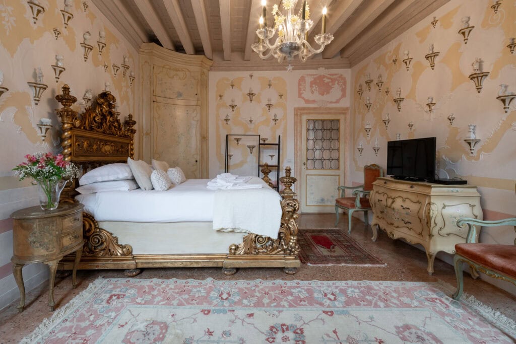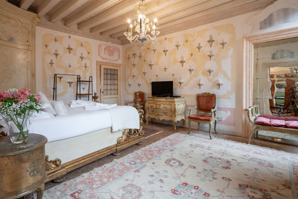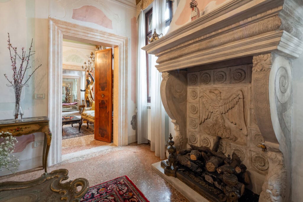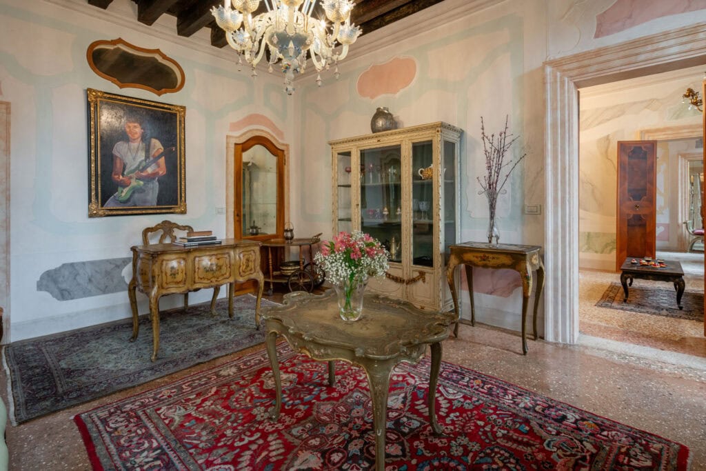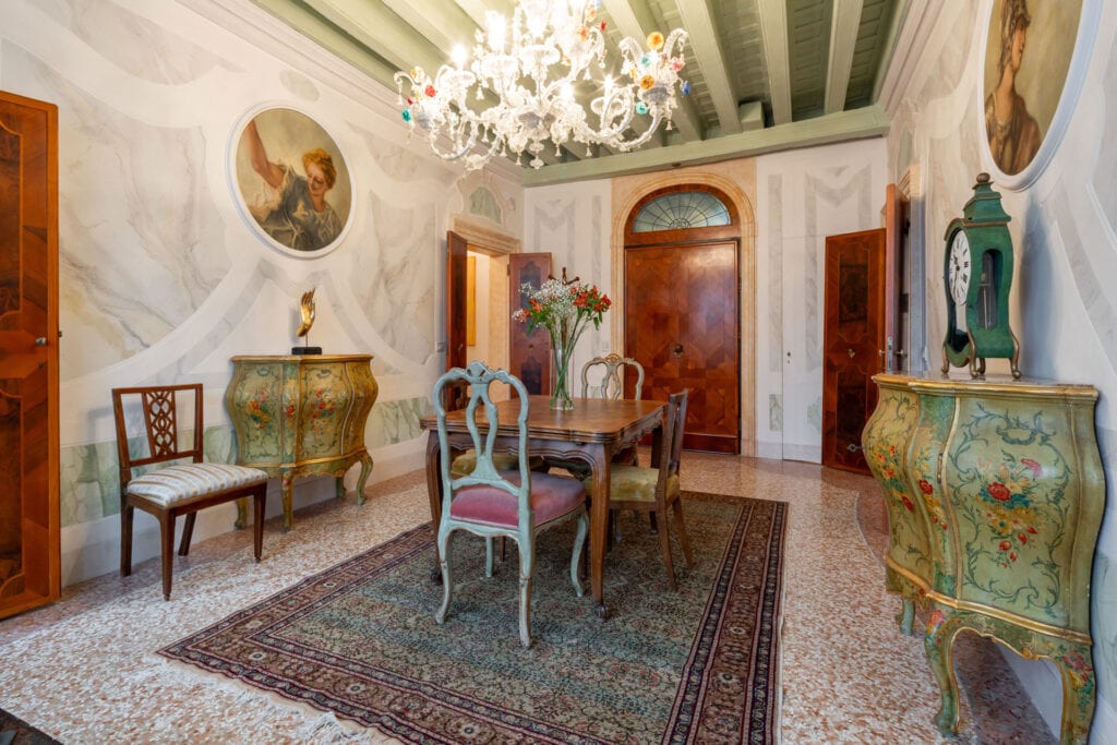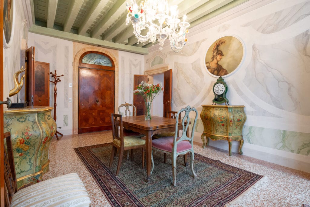 This apartment is located in the San Samuele area within the San Marco District. Decorated in a typical Venetian style it has stucco decorations on the walls and ceiling of the apartment, typical Venetian “Rezzonico” chandeliers and being on a second floor, it is very bright with more than 10 windows facing all four side of the building.