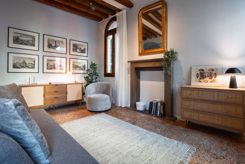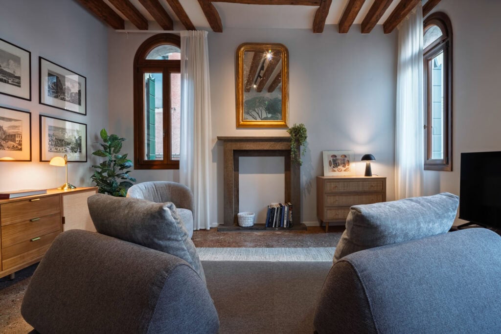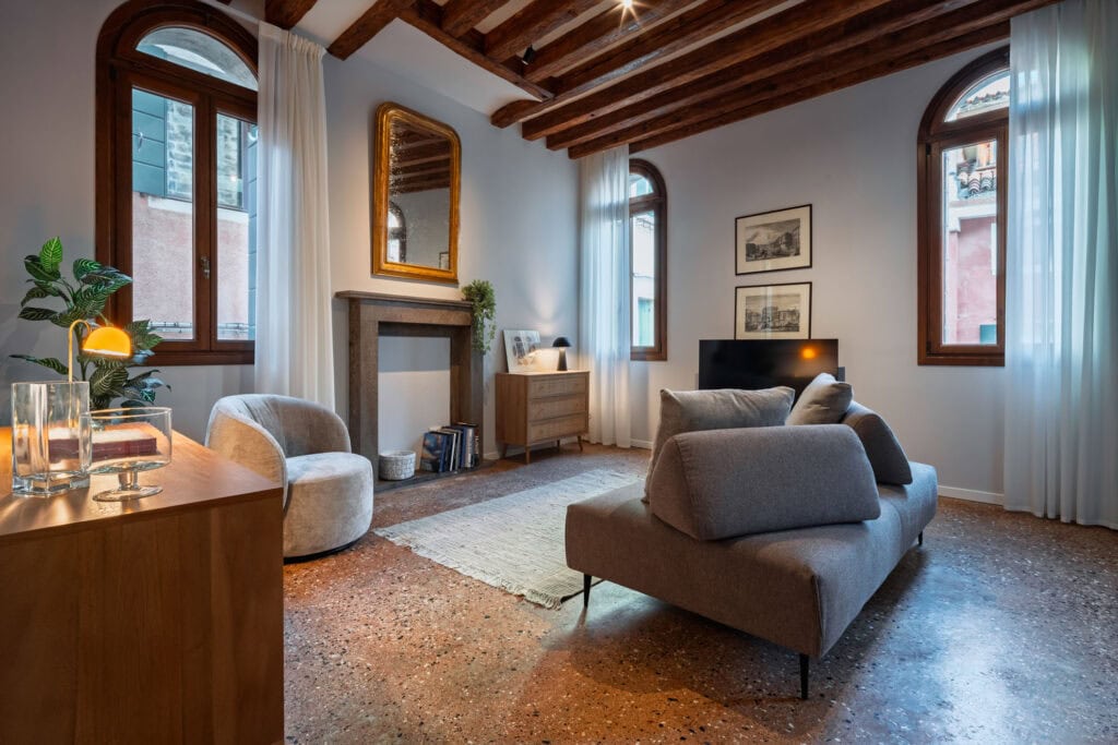 Two bedrooms, two bathrooms, and a charming living space in a historic palazzetto in San Marco.