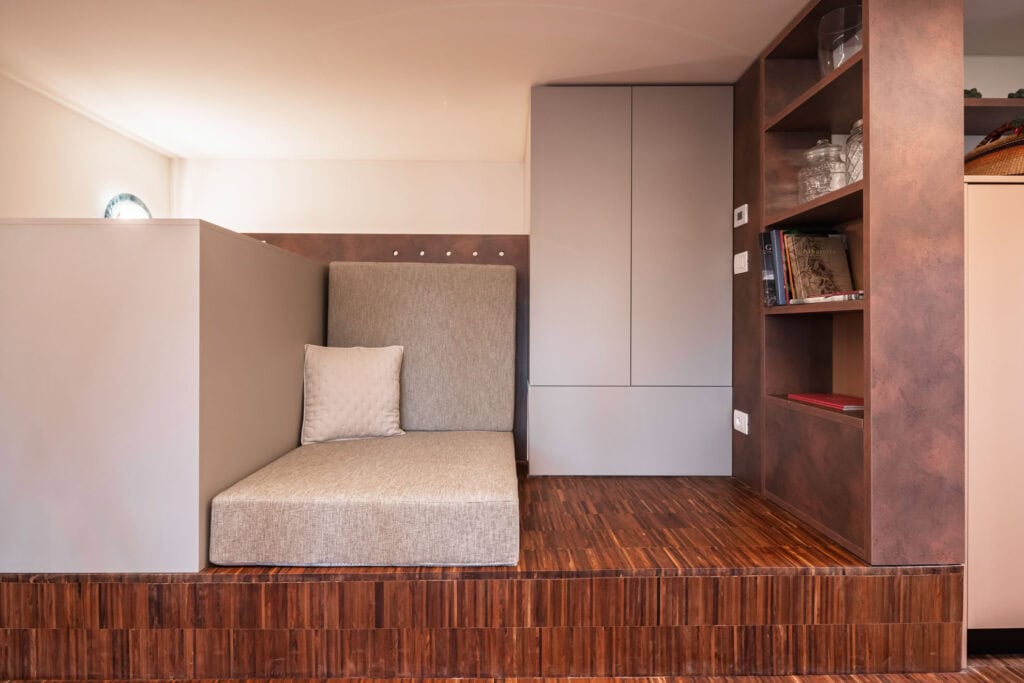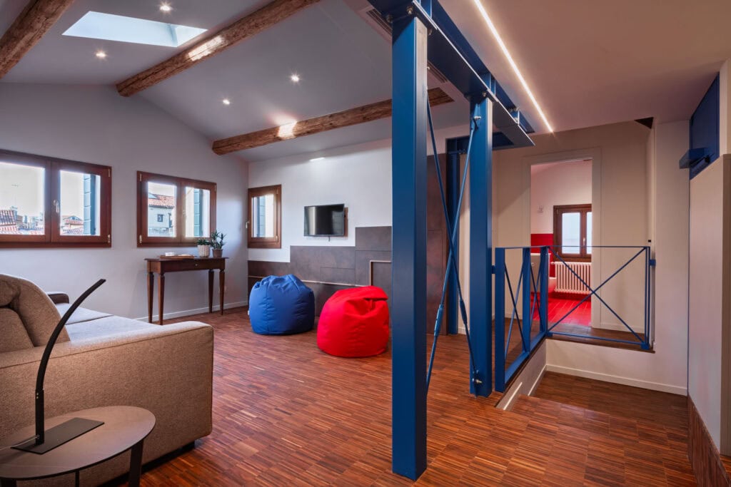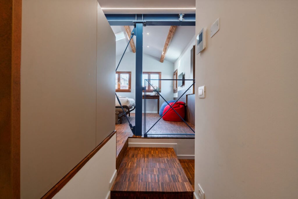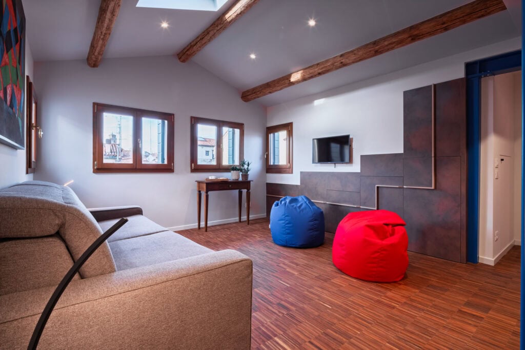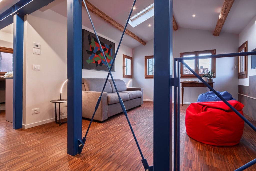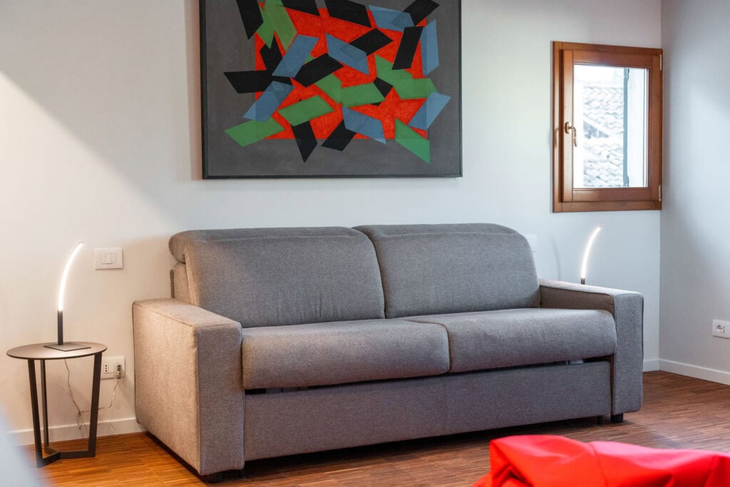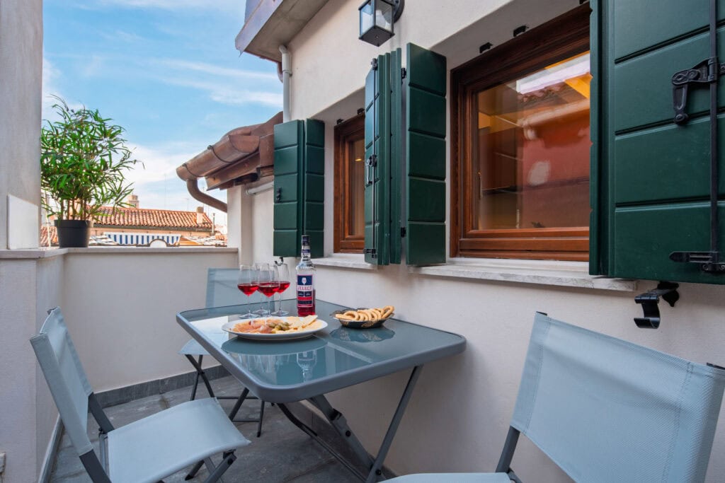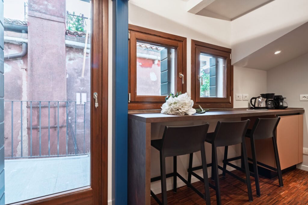 Ca’ Vida Terrazze is a stylish loft featuring a spacious open-plan living area with a sofa bed, a bathroom with a shower, and a beautiful terrace. The terrace is seamlessly connected to the kitchen through two windows, allowing guests to enjoy the sun and fresh air while dining or sipping an aperitif, with the convenience of passing dishes directly from the kitchen.