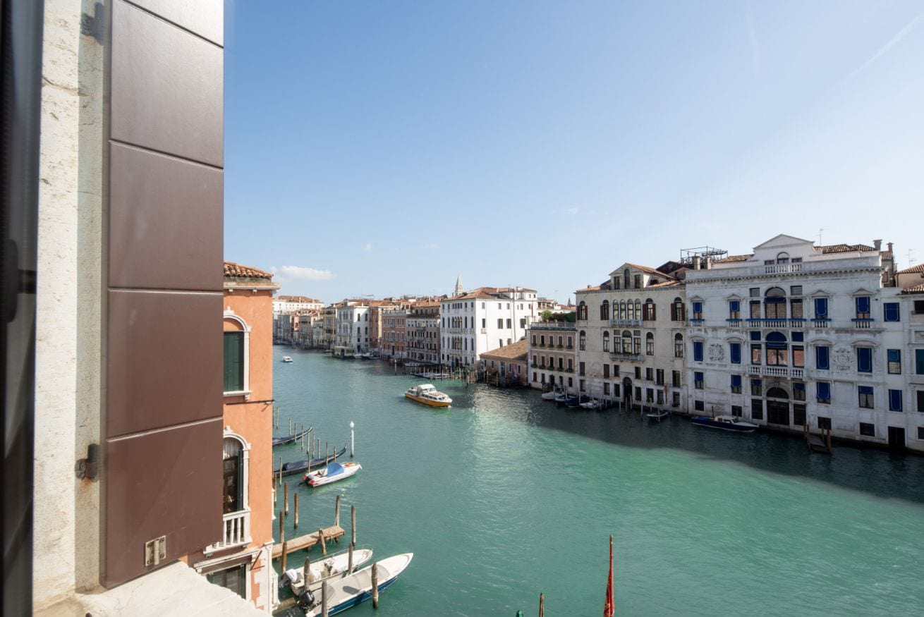 L’appartement dispose de deux salles de bains modernes entièrement équipées et d’un vaste espace de vie ouvert d’environ 50 mètres carrés, encadré par deux grandes fenêtres donnant sur le Grand Canal.