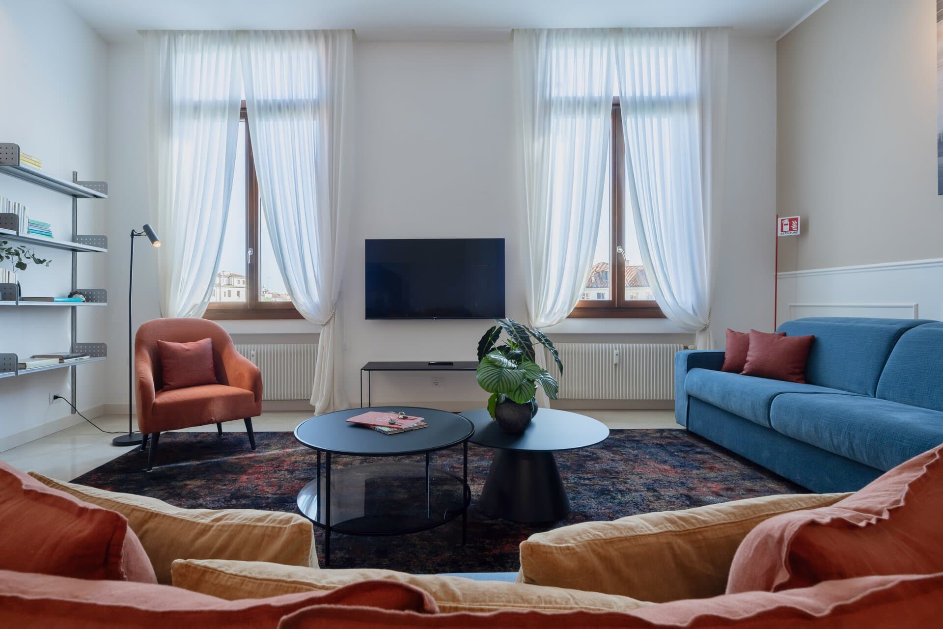 La cuisine et la salle à manger, réunies dans un espace ouvert, peuvent accueillir jusqu’à huit convives, parfait pour des moments de partage autour de la table. Le salon spacieux est aménagé avec deux grands canapés, des coussins moelleux et une petite bibliothèque, créant une atmosphère chaleureuse et accueillante. Récemment restauré et élégamment meublé, l’Appartement Maestrale allie le confort contemporain au charme intemporel de Venise.