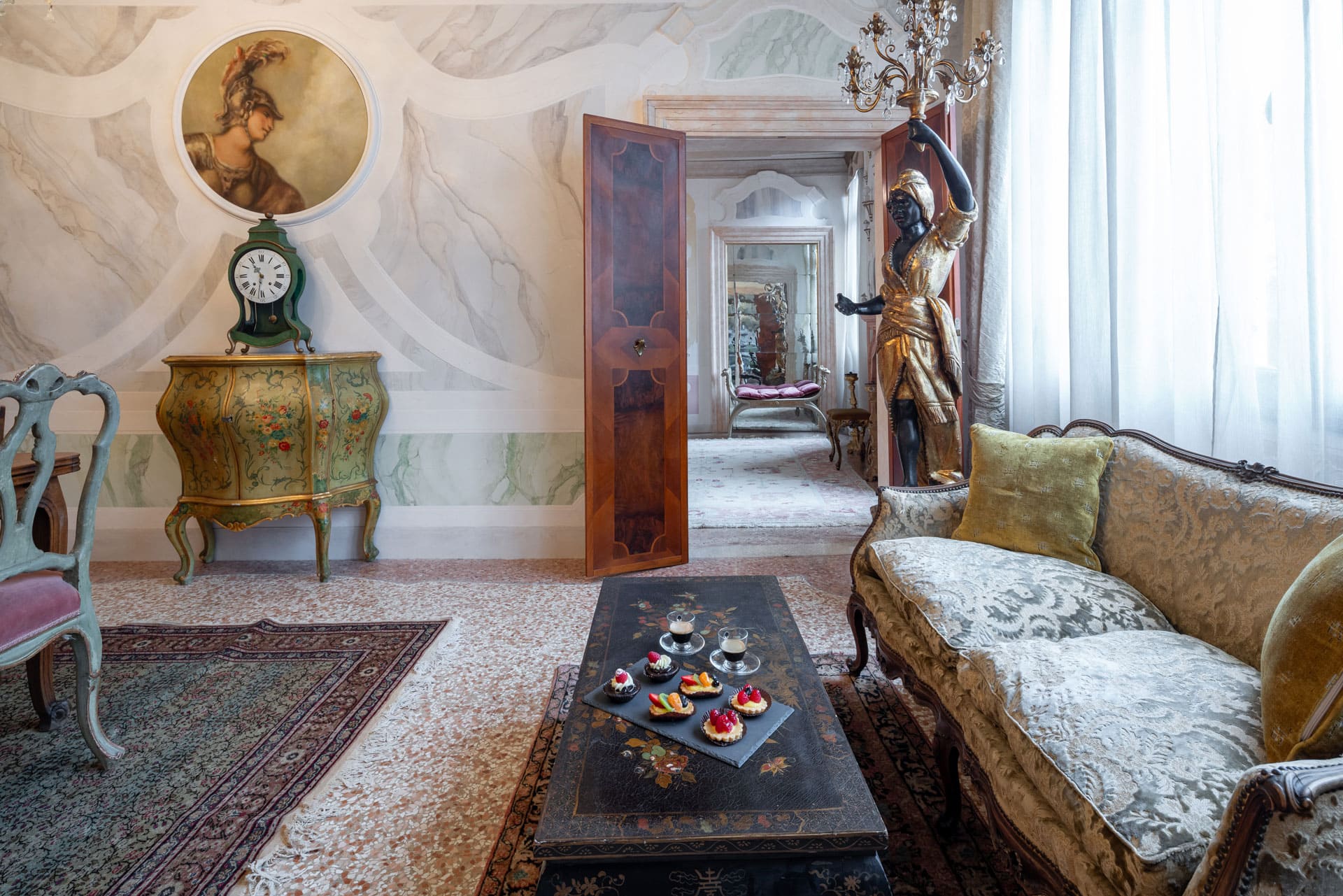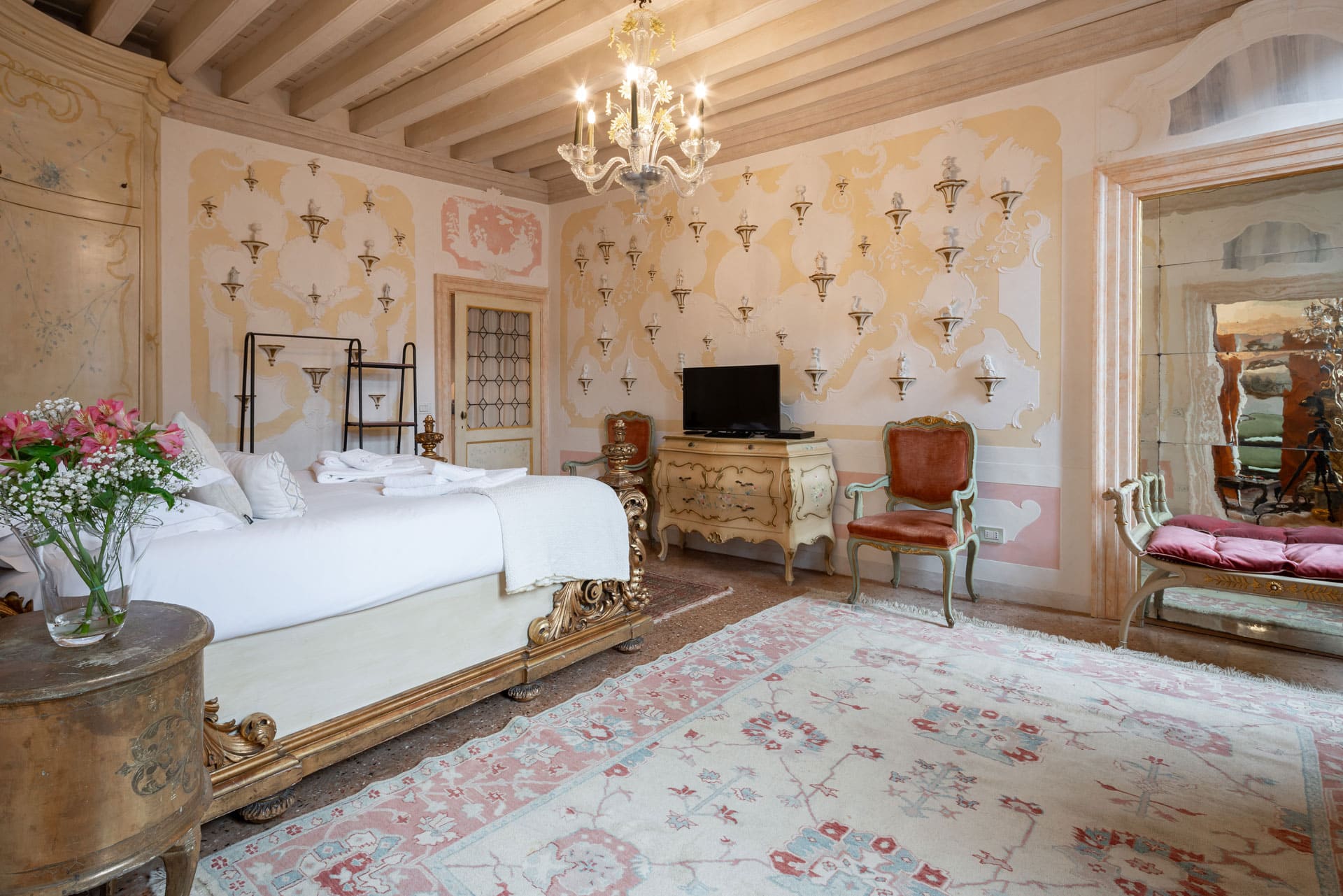 Cet appartement est situé dans le quartier de San Samuele, dans le quartier de San Marco. Décoré dans un style typiquement vénitien, il présente des décorations en stuc sur les murs et le plafond de l’appartement, des lustres « Rezzonico » typiques vénitiens et étant situé au deuxième étage, il est très lumineux avec plus de 10 fenêtres donnant sur les quatre côtés du bâtiment.
