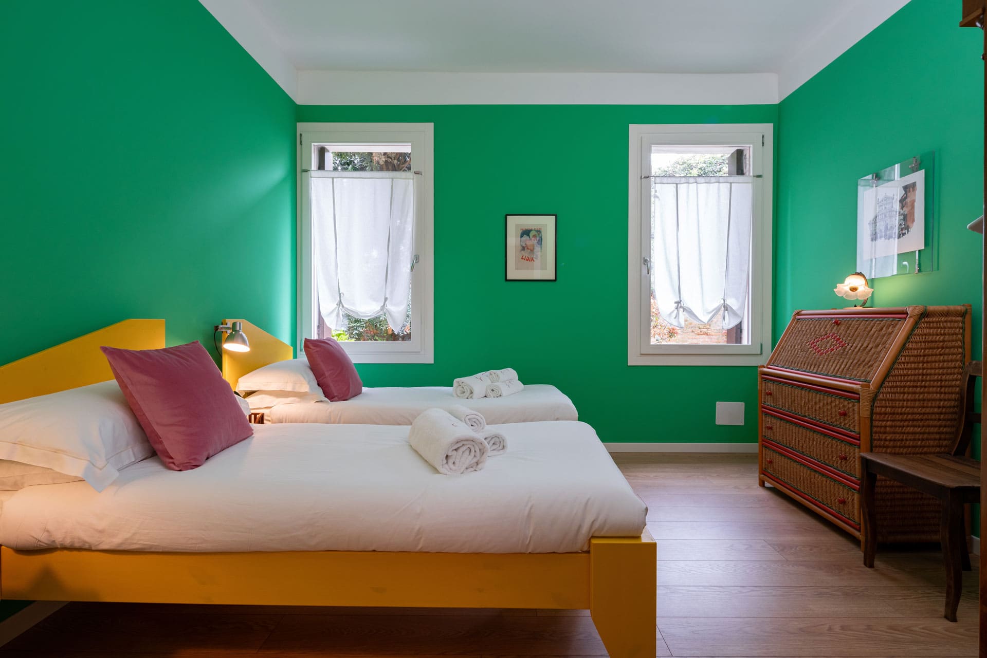 Questo appartamento si trova nella zona di Santa Marta, nel sestiere Dorsoduro a Venezia. Il vecchio cortile del molo commerciale ora è una vivace zona universitaria e piena di bar carini. Posizionato su un lato del canale del “Rio delle Terese” e vicino al “Ponte Longo di Santa Marta”. Si tratta di un appartamento con giardino con tre camere matrimoniali e due bagni. Il giardino circonda l’appartamento che si trova pochi gradini sopra il livello stradale.