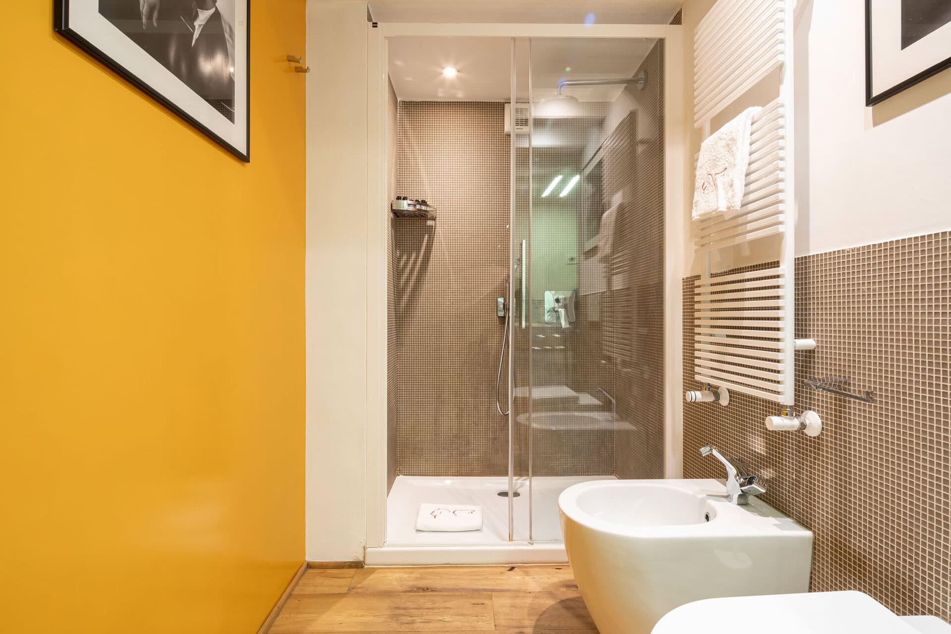 Bagno elegante con ampia doccia.In evidenza