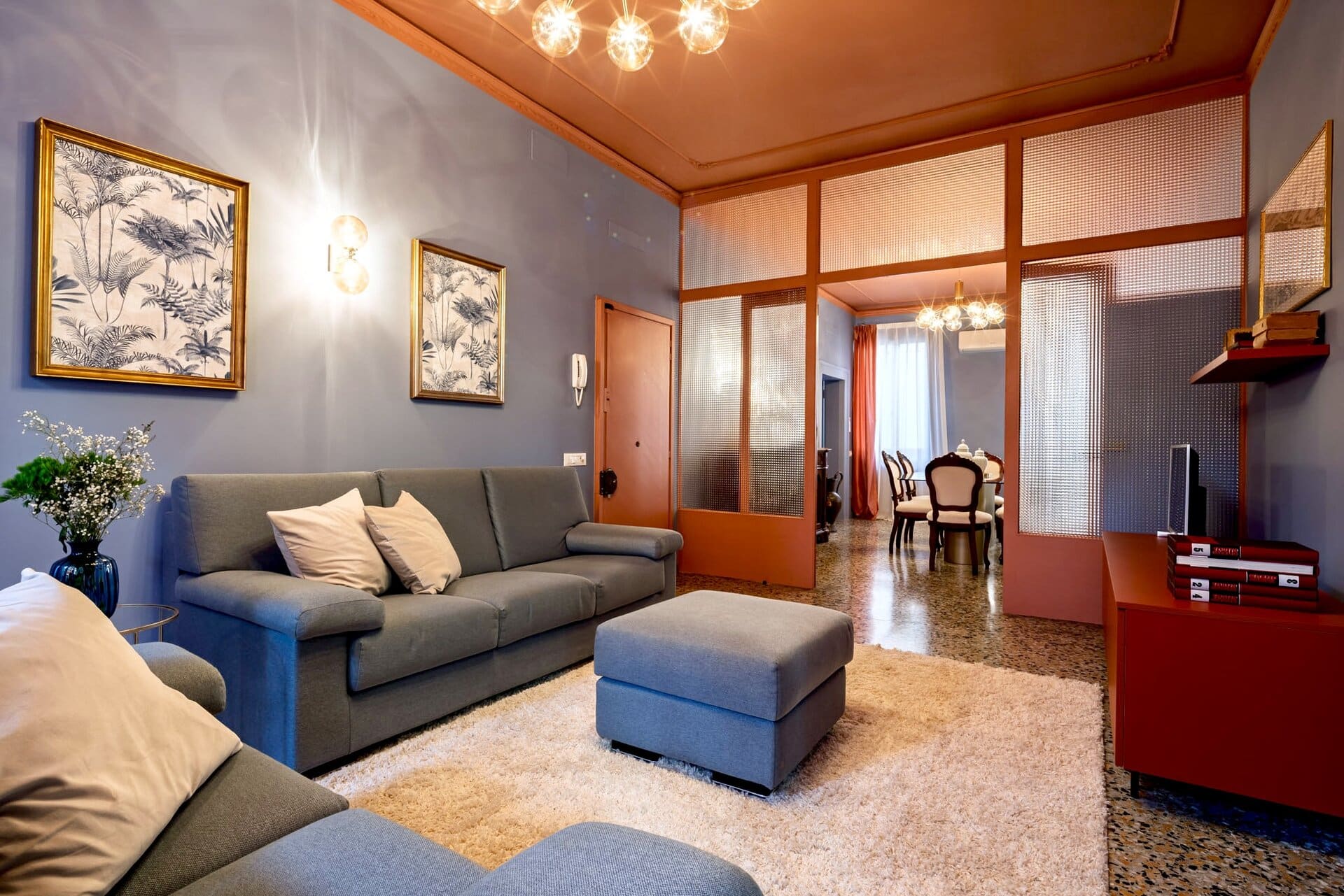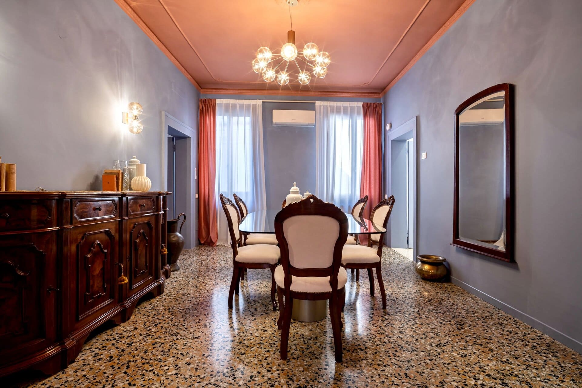 L’ampio appartamento si compone di una zona giorno con grande salone finestrato con balconcino che si affaccia sulla calle. Una spaziosa sala da pranzo arredata con mobili d’antiquariato ospita un tavolo da 6-8 persone. I due spazi sono divisi da una parete vetrata, che dona luminosità ad entrambi.